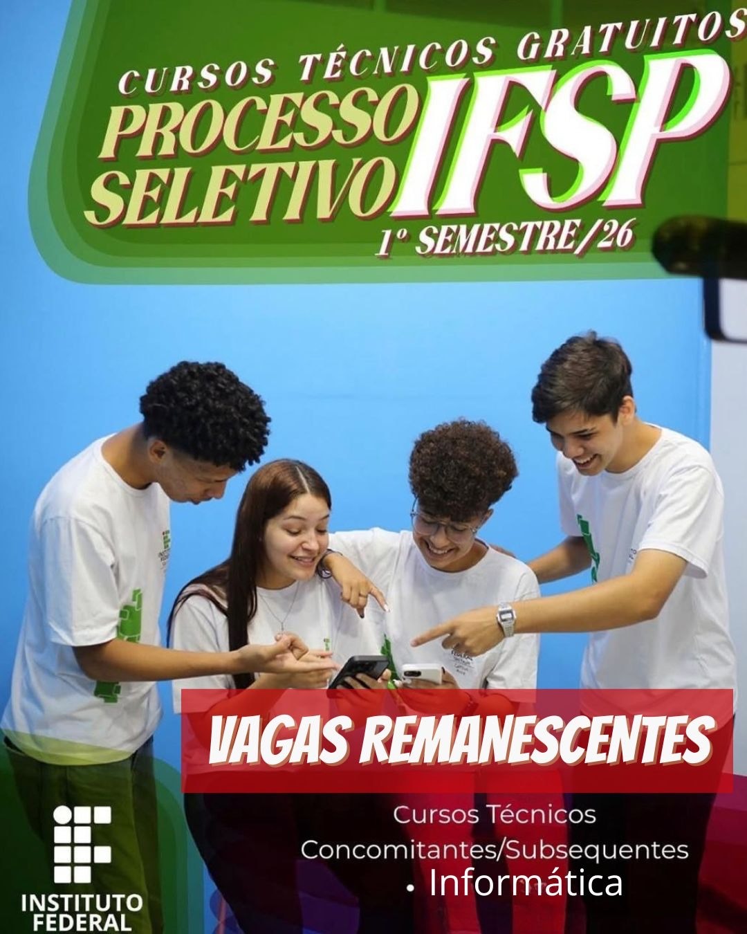 Descrição da imagem- A imagem é um cartaz de divulgação do Instituto Federal de São Paulo (IFSP). Na parte superior da imagem, sobre um fundo verde, está escrito em letras grandes e coloridas: “CURSOS TÉCNICOS GRATUITOS – PROCESSO SELETIVO IFSP – 1º SEMESTRE/26”. No centro da cena, há uma fotografia colorida de um grupo de quatro estudantes com uniformes do IFSP olhando para o celular e sorrindo. Na parte inferior direita, sobre um fundo em tom vermelho vinho, lê-se em destaque:  Inscrições  prorrogadas até 06/11/2025. No canto inferior esquerdo, sobre um fundo esverdeado, aparece o logotipo do IFSP, que consiste em quadrados brancos formando a letra F, seguido do texto “INSTITUTO FEDERAL – São Paulo”.